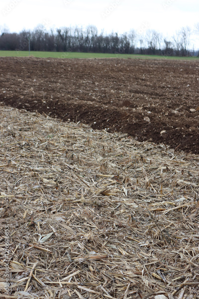 Cut Corn field near plowed field and green meadow on winter season n the italian countryside