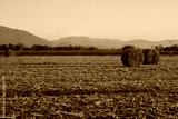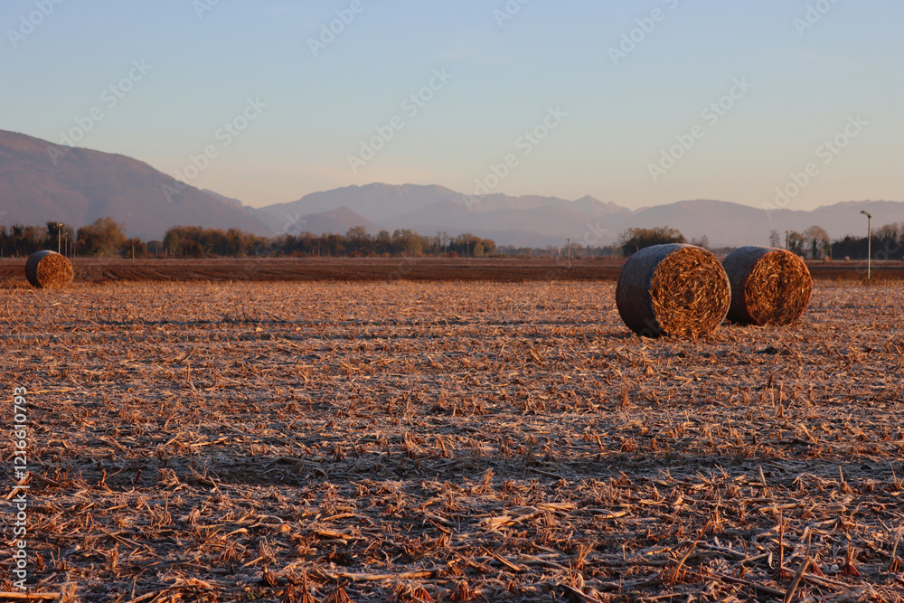 Dry hay bales on a harvested corn field with frost on early morning on winter season. Agricultural landscape in northern Italy