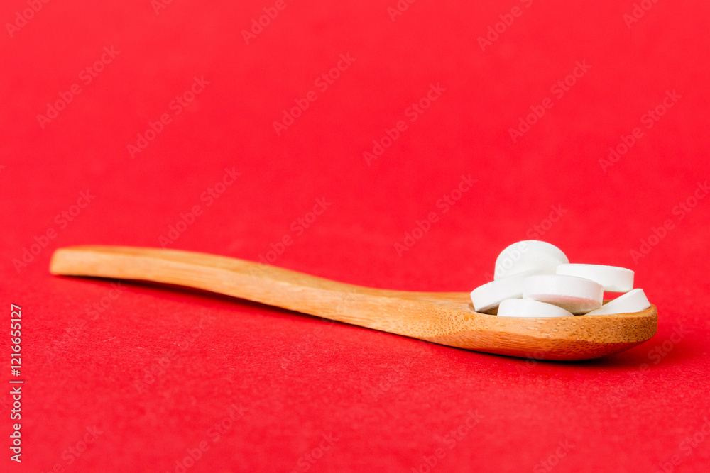 Heap of white pills on colored background. Tablets scattered on a table. Pile of red soft gelatin capsule. Vitamins and dietary supplements concept
