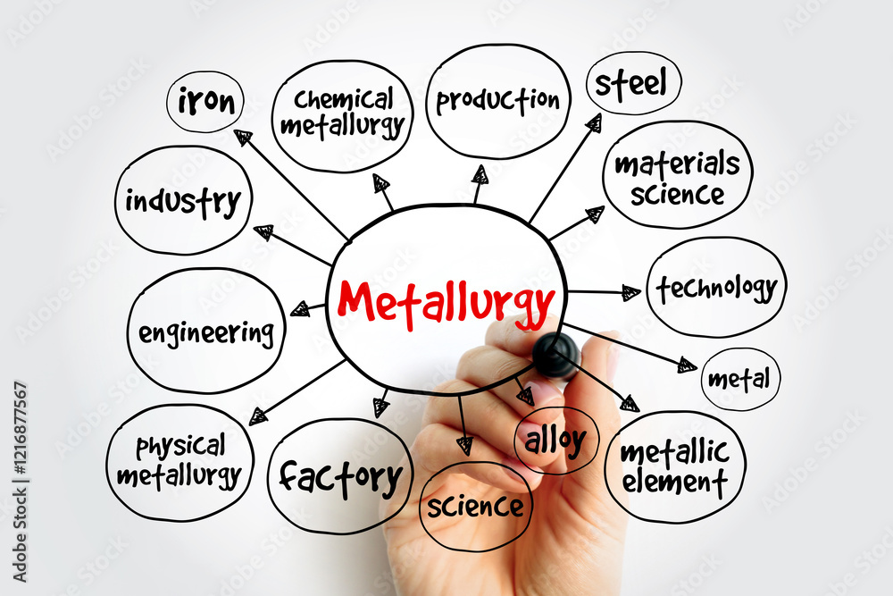 Metallurgy - process that is used for the extraction of metals in their pure form, mind map concept background