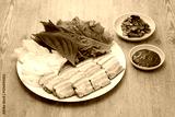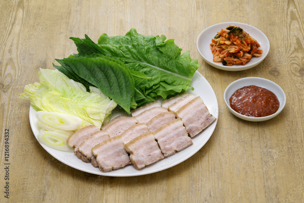 Bossam (sliced boiled pork belly wrapped with leaf vegetables ), Korean cuisine