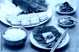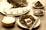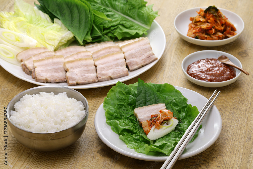 Bossam (sliced boiled pork belly wrapped with leaf vegetables ), Korean cuisine