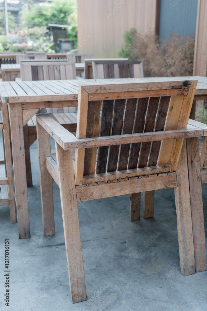 Vintage wood chair at outdoor terrace. Outdoor dining area