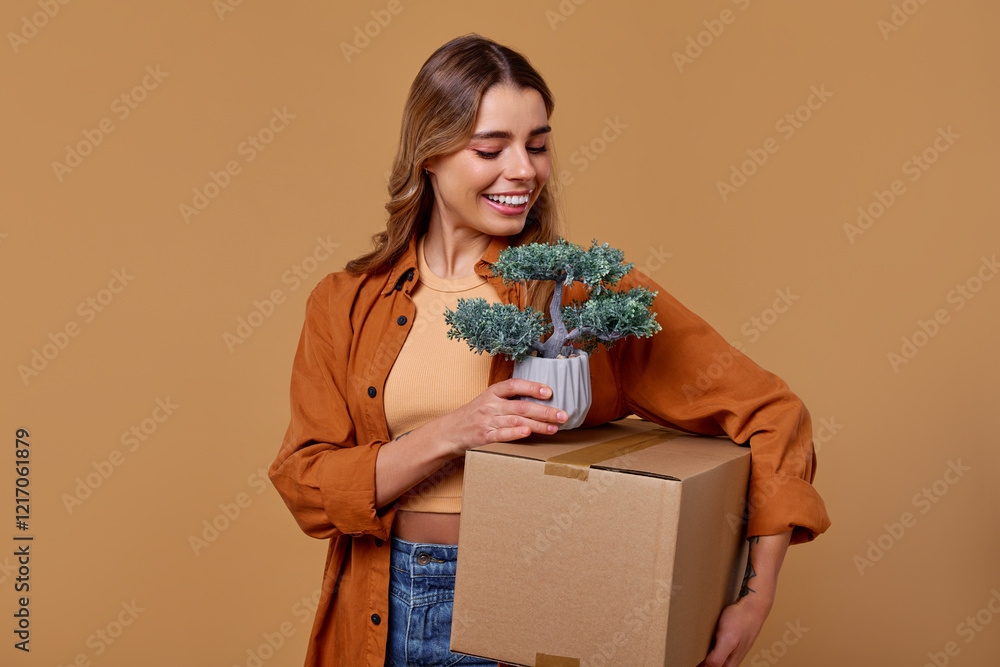 A woman smiles cheerfully with a potted plant and a moving box on a beige background