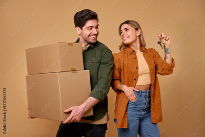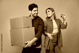 A Thrilled Couple Joyfully Celebrating Their New Home Surrounded by Moving Boxes and Keys