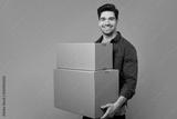 A man is carrying several boxes against a warm beige background, showcasing his effort