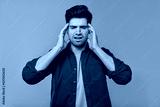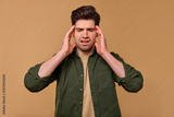 A Stressed Young Man is Holding His Head with Frustration Against a Brown Background