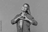 A Cheerful Young Woman Happily Making a Heart Gesture Against a Warm and Inviting Background