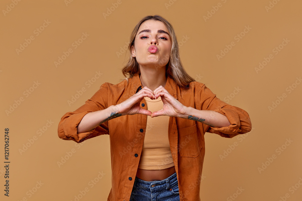 A Cheerful Young Woman Happily Making a Heart Gesture Against a Warm and Inviting Background