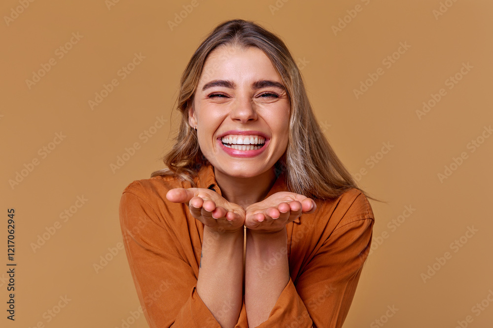 A Cheerful and Joyful Young Woman is Sending a Kiss Against a Warm, Inviting Background