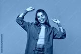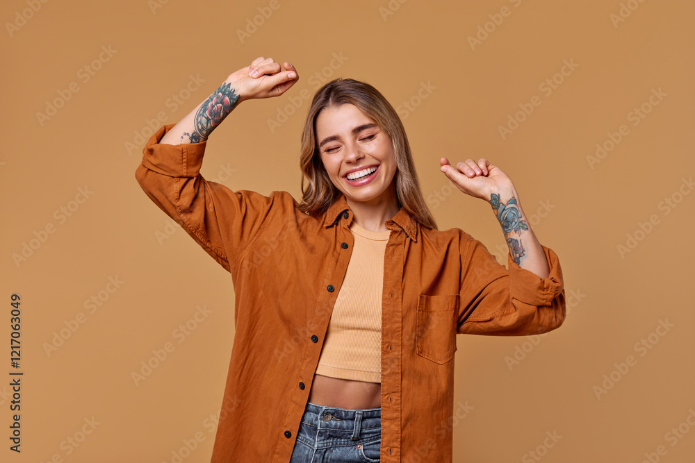 A Joyful Young Woman is Dancing BreastFree with Tattooed Arms Against a Warm Background