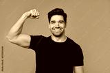 A Confident Young Man Proudly Flexing His Strong Biceps Against a Simple Neutral Background