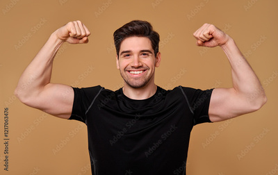 A Confident Young Man Proudly Flexing His Strong Biceps Against a Simple Neutral Background