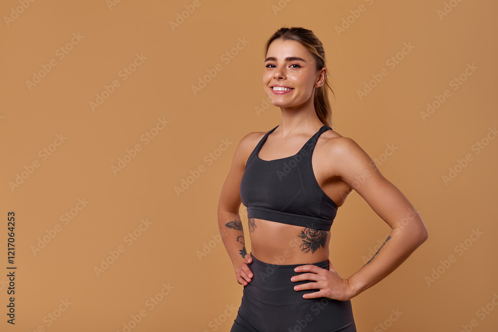 A Confident Young Female Fitness Model Dressed in Stylish Activewear Against a Plain Background