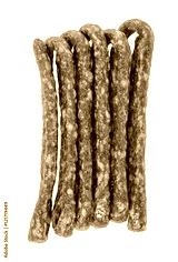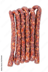 tasty delicious smoked dried sausages, thin salami is isolated o