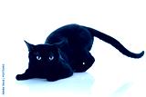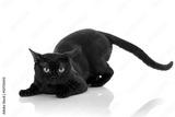 black cat Bombay on a white background sat in the front paws. preparing to attack. predator style