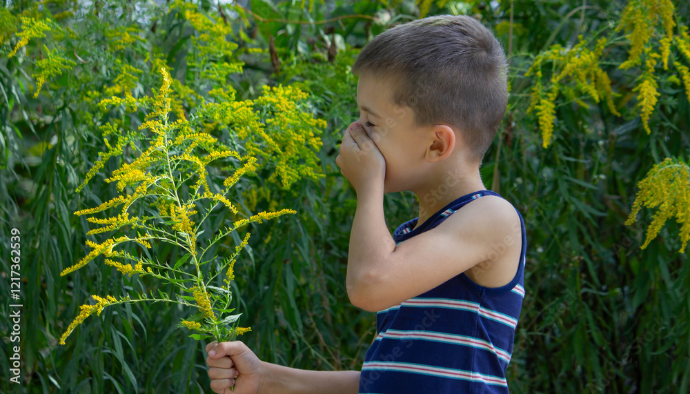 Child Sneezing Outdoors Near Goldenrod Plants, Seasonal Allergy Concept