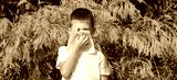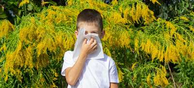 Child Sneezing Outdoors Near Goldenrod Plants, Seasonal Allergy Concept
