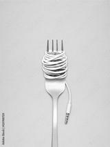 Food for new generation / A shining fork with noodle made of cable with music jack plug in metal background.