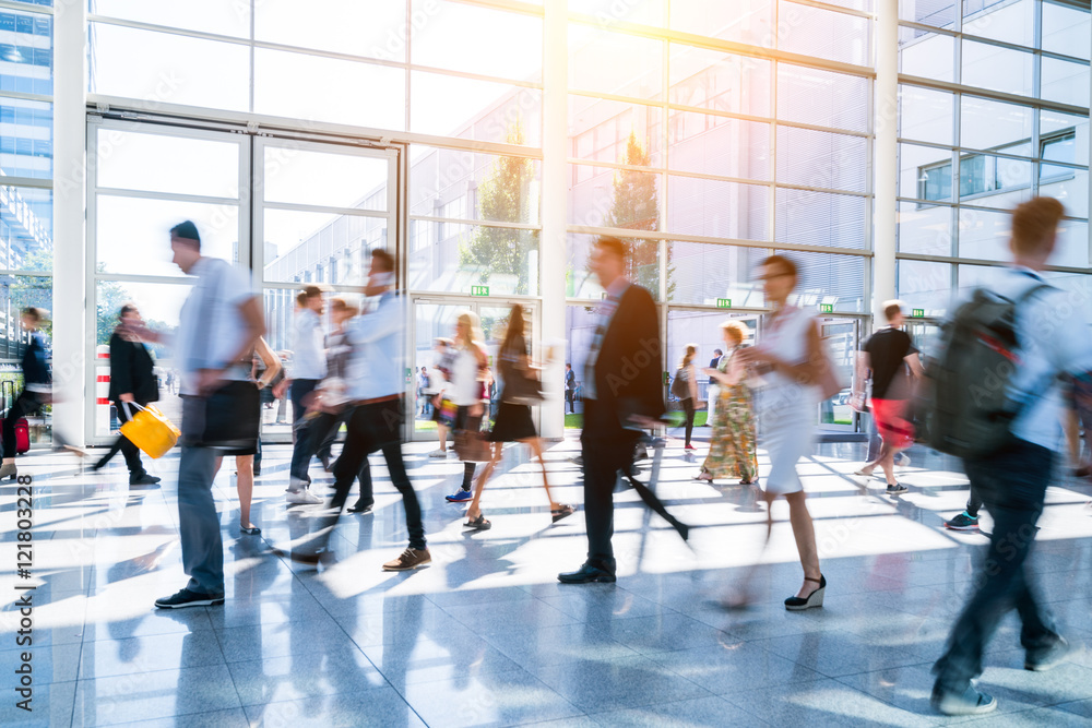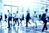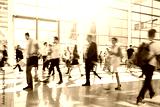 blurred people walking in a modern hall