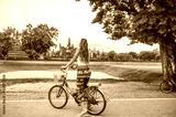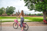 Woman on a pink bicycle admiring the ancient ruins of Sukhothai Historical Park, surrounded by lush greenery and historic structures in Thailand