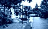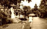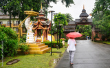 GTourist walking under the rain with red umbrella near a traditional temple in Sukhothai, Thailandenerated image