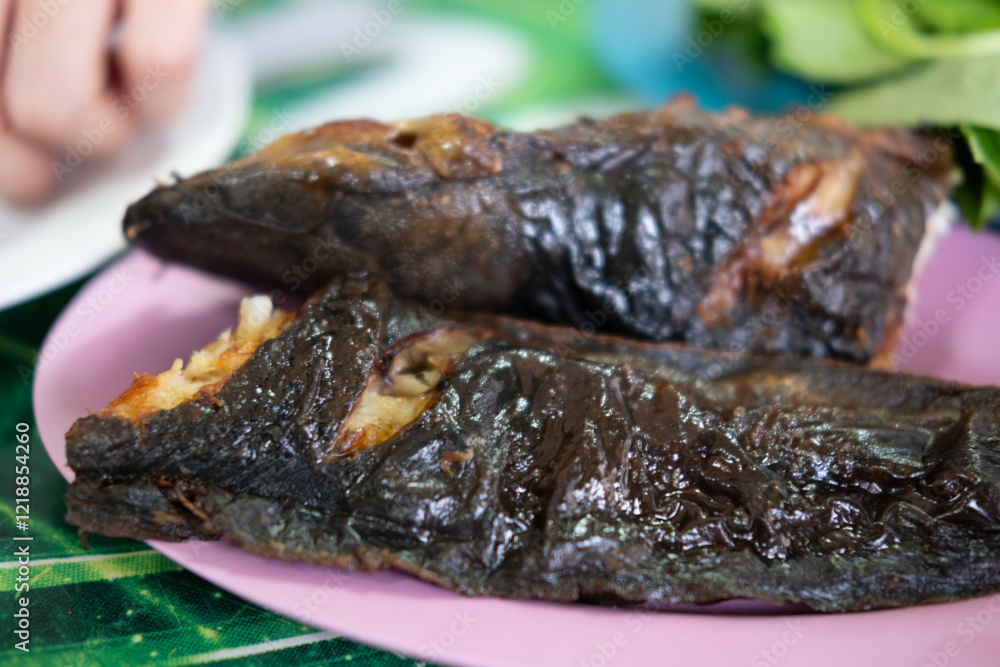 Grilled catfish fish on pink dish. Delicious Thai street food that is available everywhere.