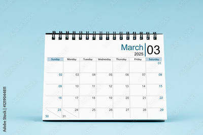 March 2025 Monthly desk calendar for 2025 year on soft blue background.