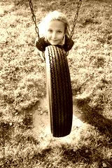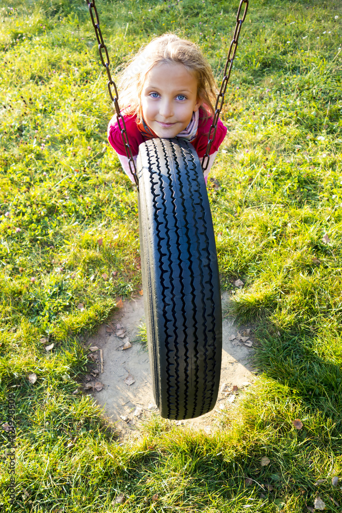 Young girl in autumn park having fun on tire swing.