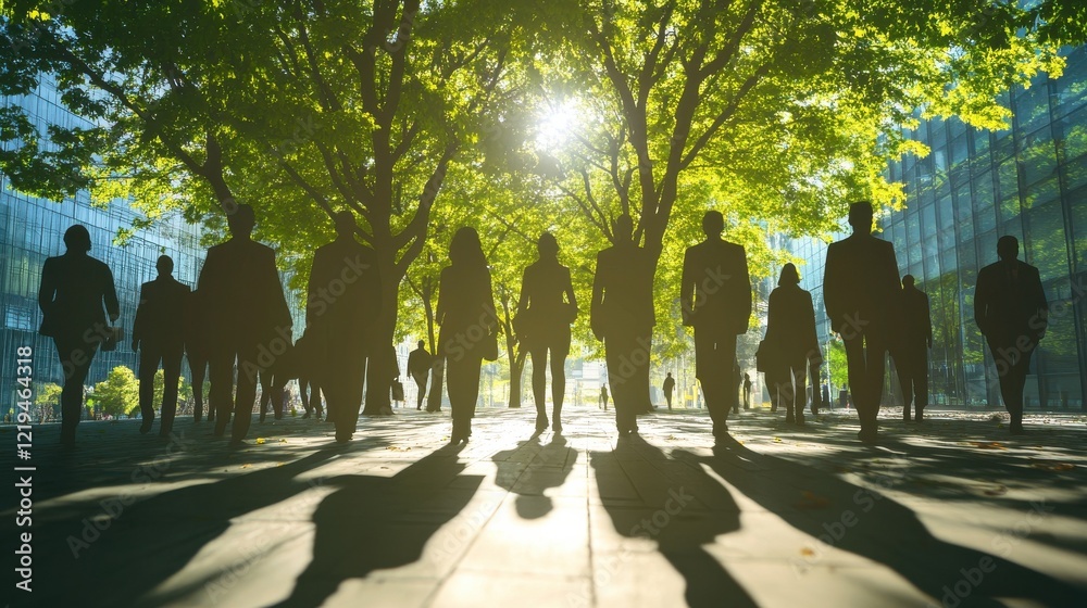 Silhouettes of business professionals blend with tree shadows, symbolizing eco-friendly practices and sustainability in the workplace. Perfect for green business concepts.