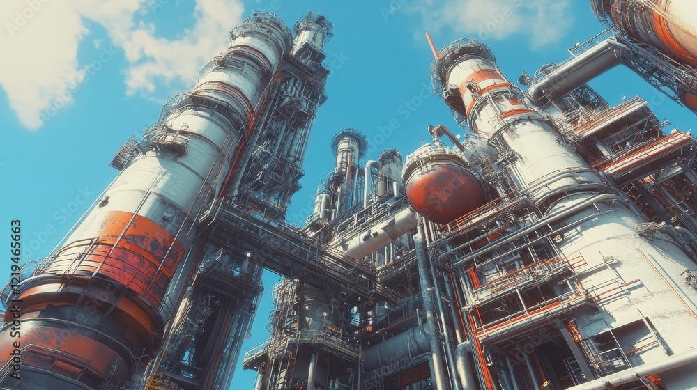 Towering industrial petrochemical refinery plant with a complex network of pipework machinery and structures against a blue sky background. The image showcases the engineering manufacturing