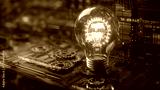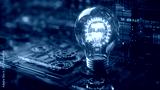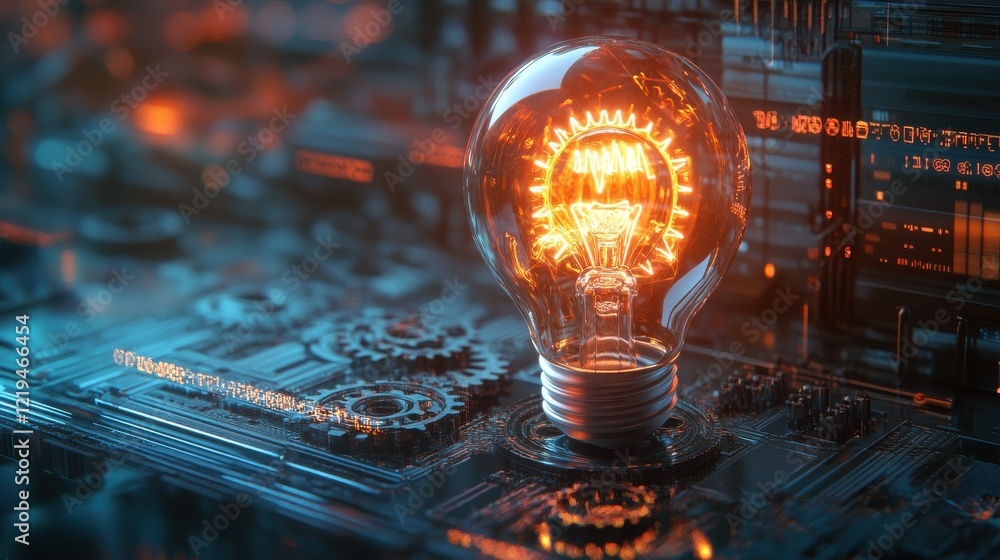 Luminous light bulb with drawing gears on creative glowing programming backdrop. Software and coding concept. 3D Rendering