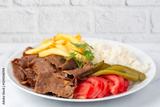 Meat doner menu, iskender menu on plate, turkish special meat doner, food, special menu (Turkish name; pilav üstü et doner)
