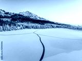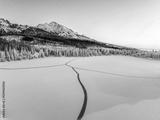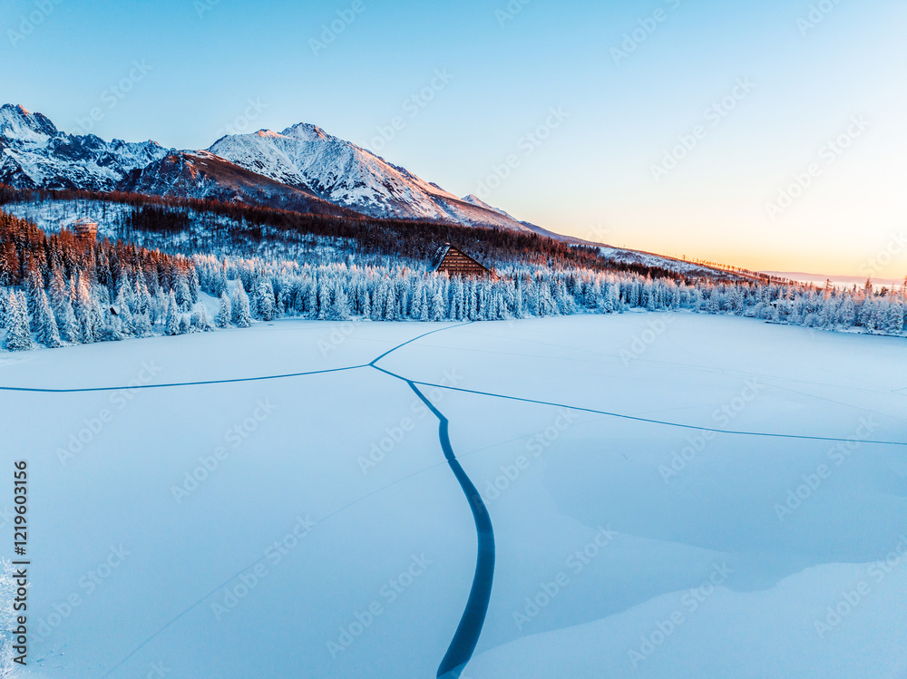 Frozen winter mountain lake Strbske pleso. Strbske lake with view of the High Tatras National Park, Slovakia