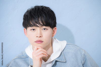 Close-up of a young man in his 20s thinking while looking at the camera. Image of beauty, fashion, etc. Copy space