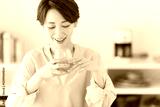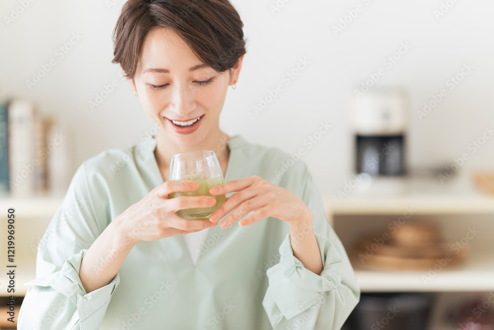 グラスに入った飲み物を飲むミドル世代の女性。