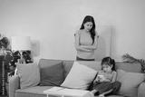 A mother scolding her daughter for excessive phone usage while sitting together on the sofa, focusing on discipline and balance.