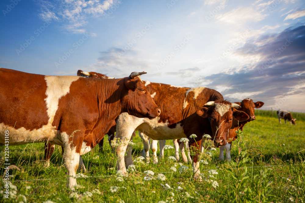 Troupeau vache vache laitière de race Rouge des Prés en pleine nature dans la campagne au printemps.