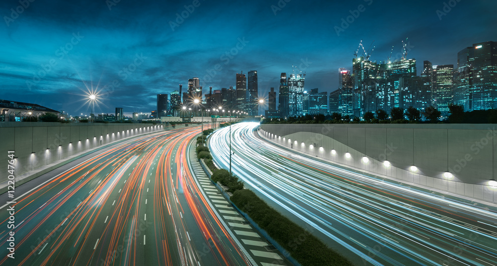 Movement of car light with Singapore cityscape skyline during twilight in dramatic tone