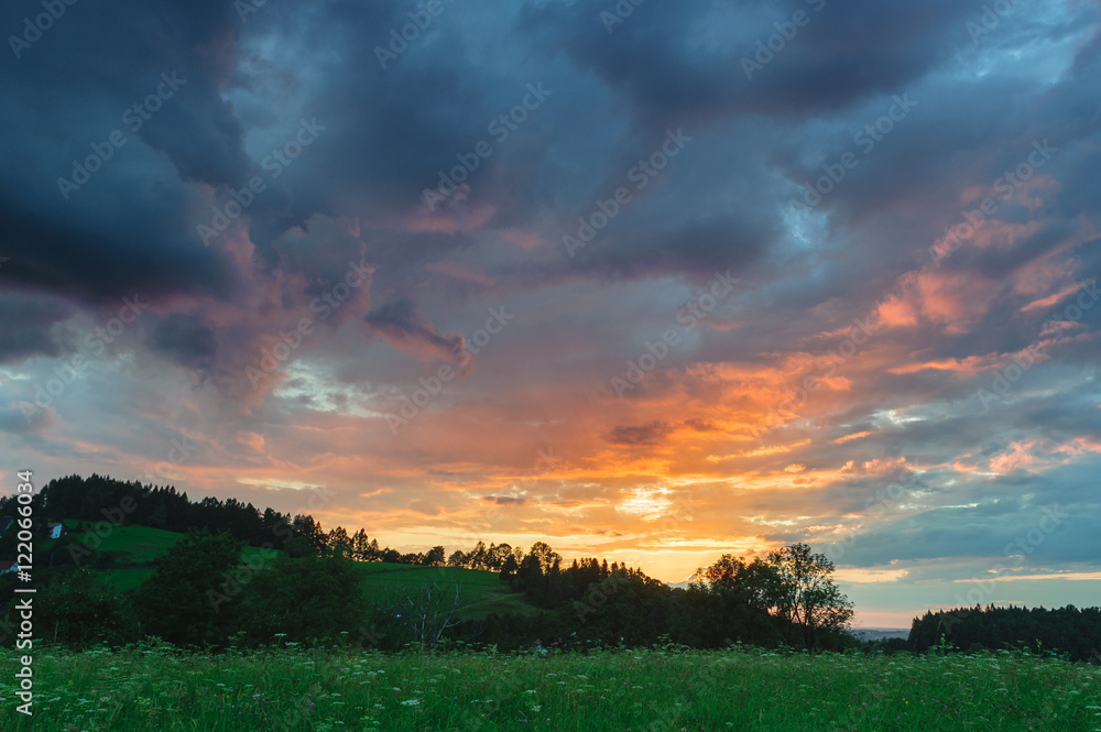 Zielone wzgórze z drzewami o zachodzie słońca i pochmurnym niebem