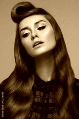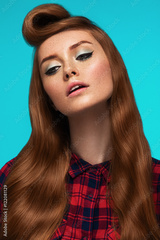 red-haired girl, freckled face, trendy makeup and hairstyle, curly woman