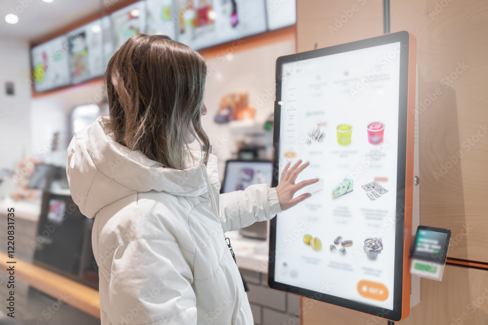 A 30 -35-year-old woman in a white winter jacket orders food through the screen menu at a fast food restaurant. A customer is utilizing a digital kiosk designed specifically for the purpose of