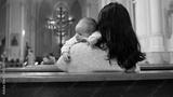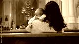 A woman holds a baby boy and sits on a bench in a Catholic church.