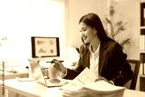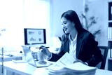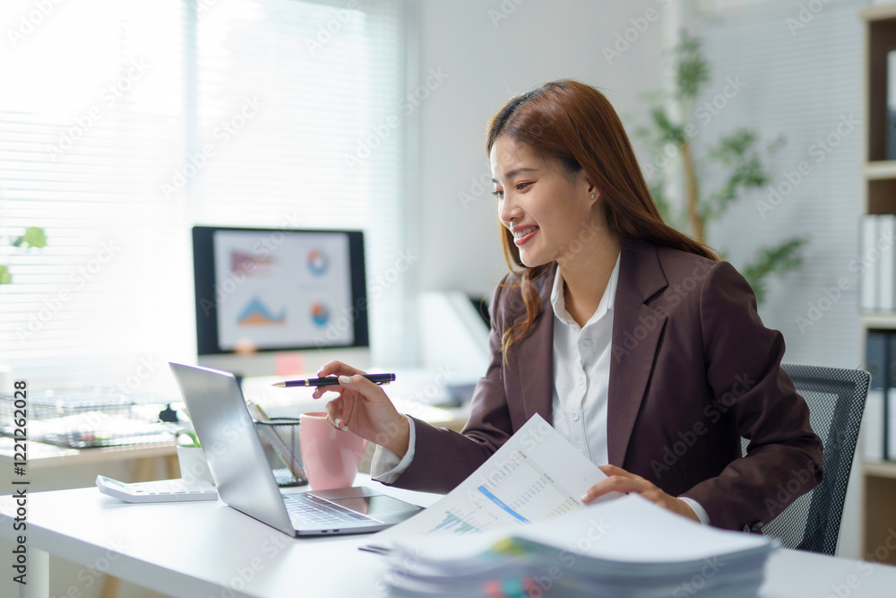 Young businesswoman analyzing financial data using laptop and documents at office desk
