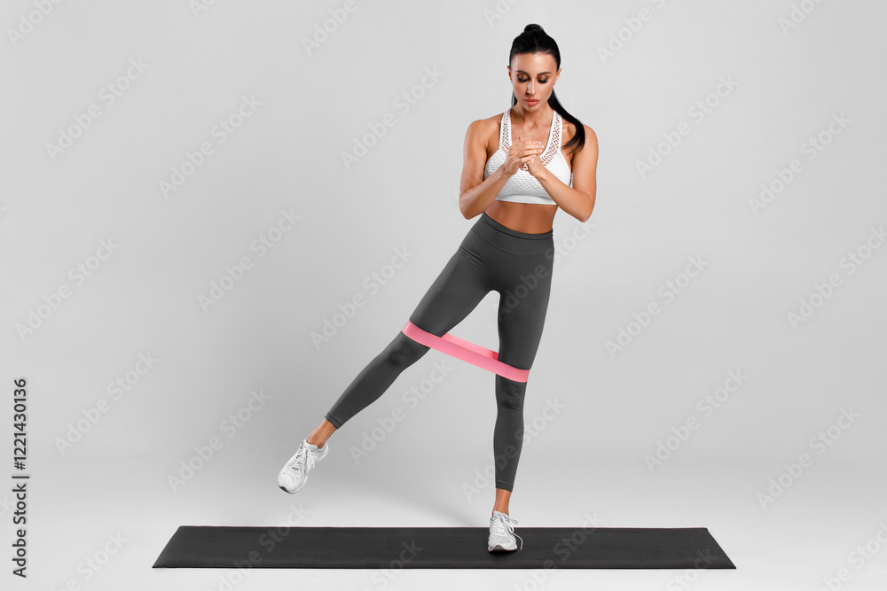Athletic girl doing exercise for glutes with resistance band on gray background. Fitness woman working out