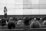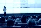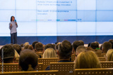 Audience listening a lecture on the conference. Focus to heads at foreground