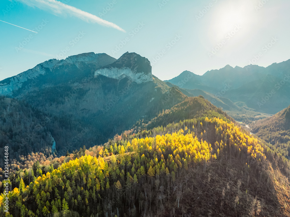 Autumn panorama of the Tatra valley in the High Tatras, with autumn trees and a road under the High Tatras