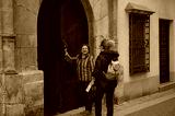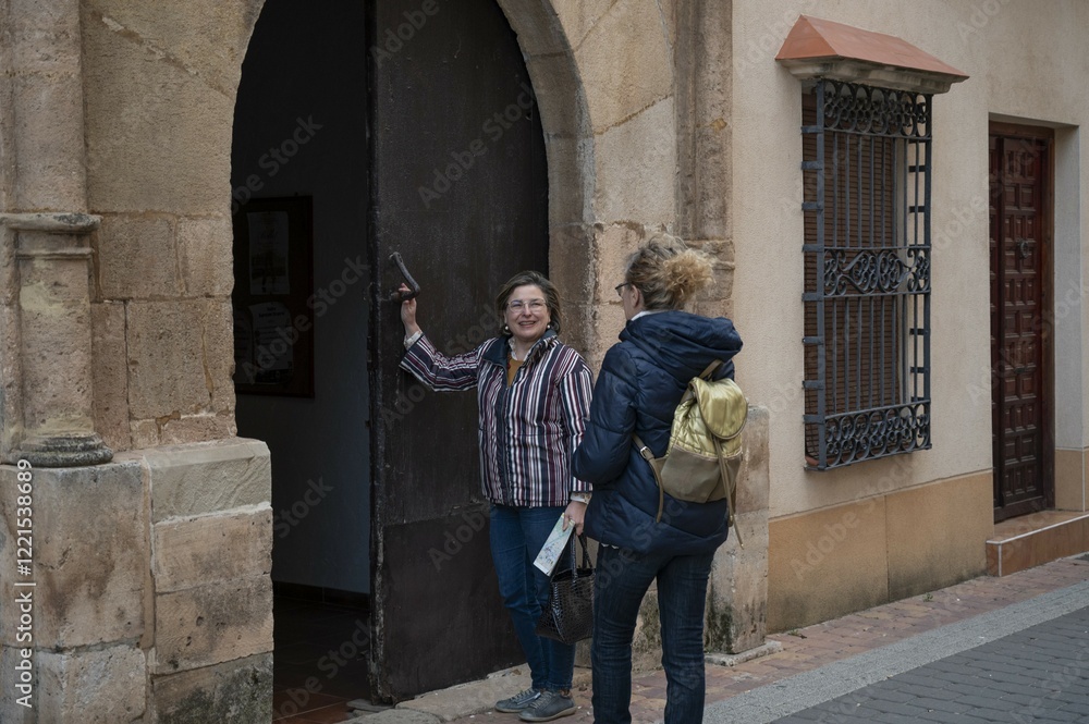 Two women exploring a historic building during a cultural tour in a Spanish village, one holding the door open