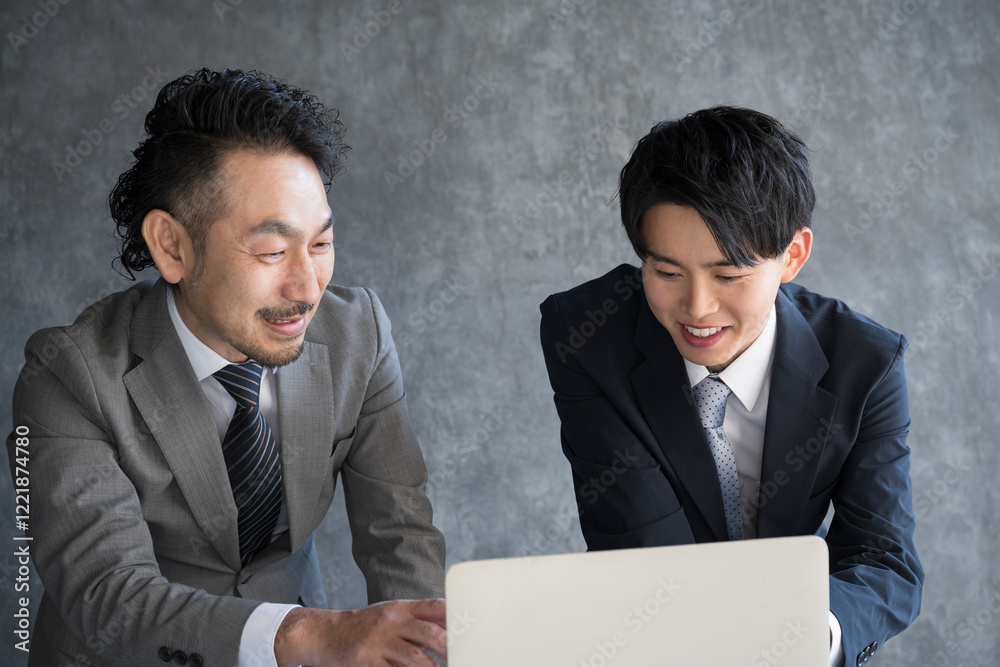 笑顔でパソコンを見るビジネスマン 上司と部下