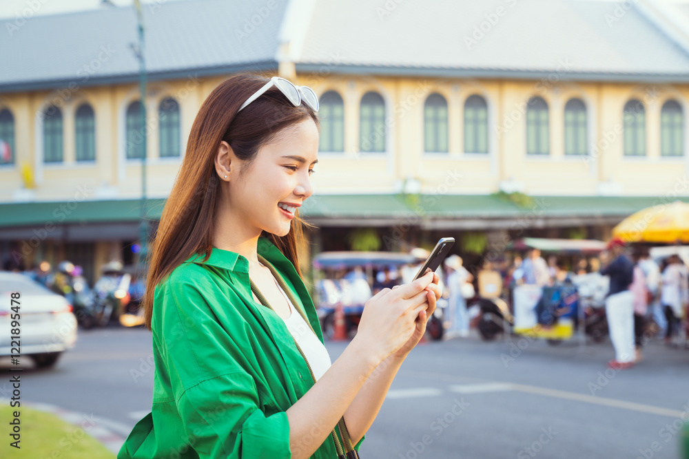Cheerful beautiful Asian woman holding smartphone and camera with looking for tourist attractions.